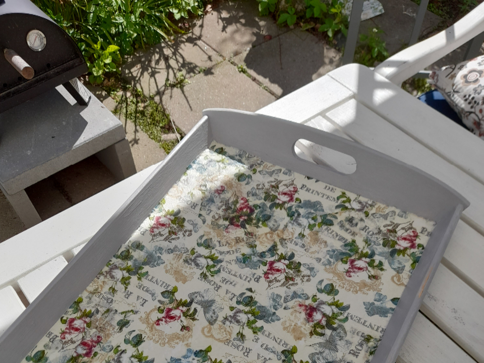 Min morgenmadsbakke var efterhånden blevet lidt slidt og kedelig at se på. Kanten var lakeret træ, og bunden hvid laminat. Så nu har jeg været i gang med lidt grå kalkmaling til kanten, og har forsøgt mig med decoupage for første gang..det er lykkedes ret godt, og bakken har fået nyt og flottere vintagelook.