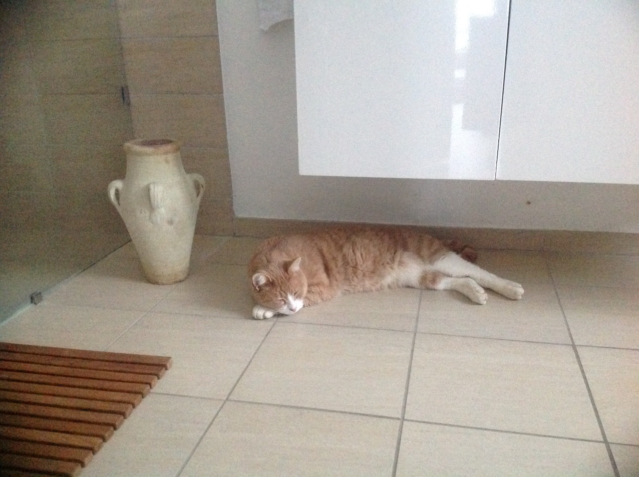 Efter en tur ude i den kolde sne, findes der vel ikke noget bedre end en lur på det varme gulv..han forstår det😉